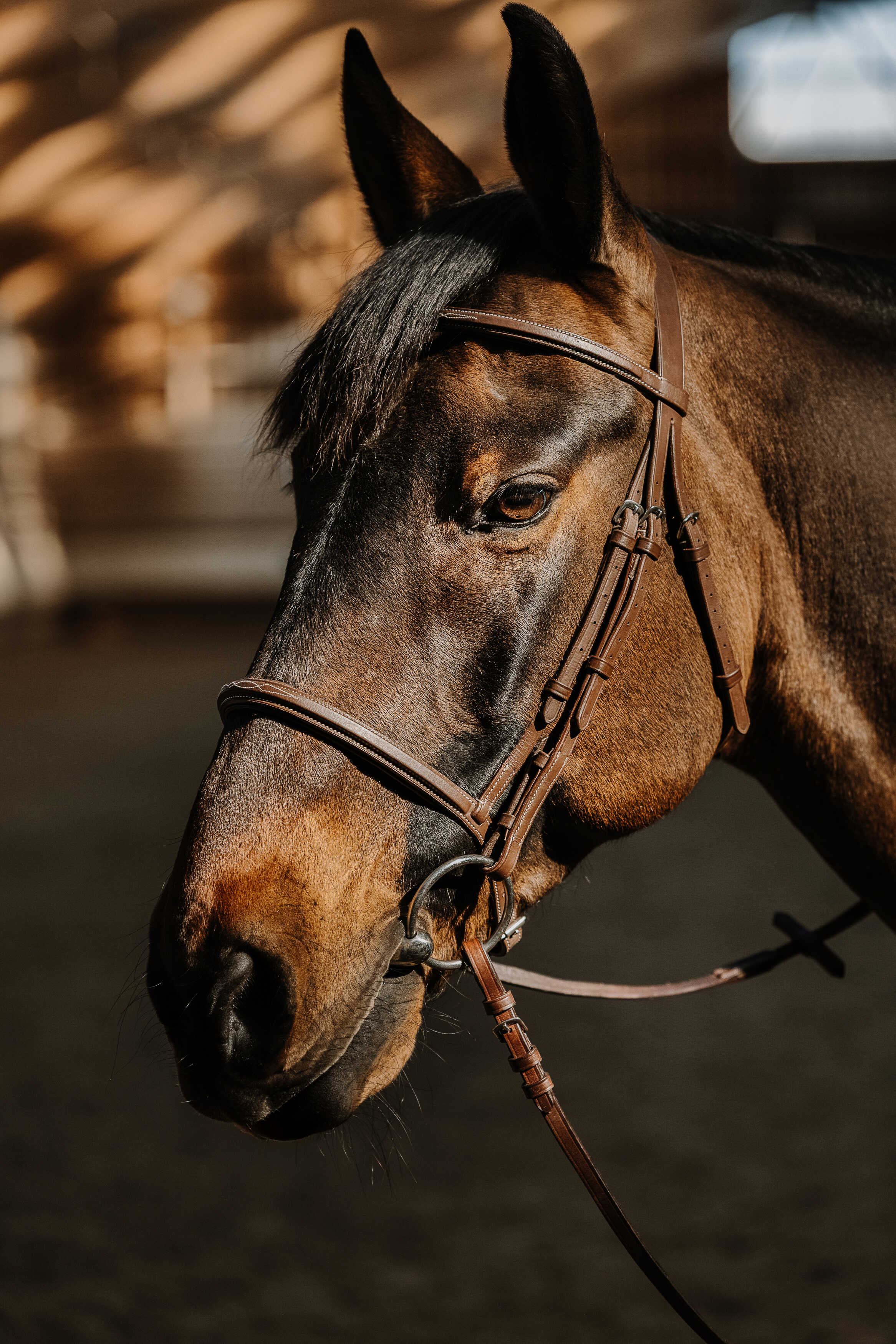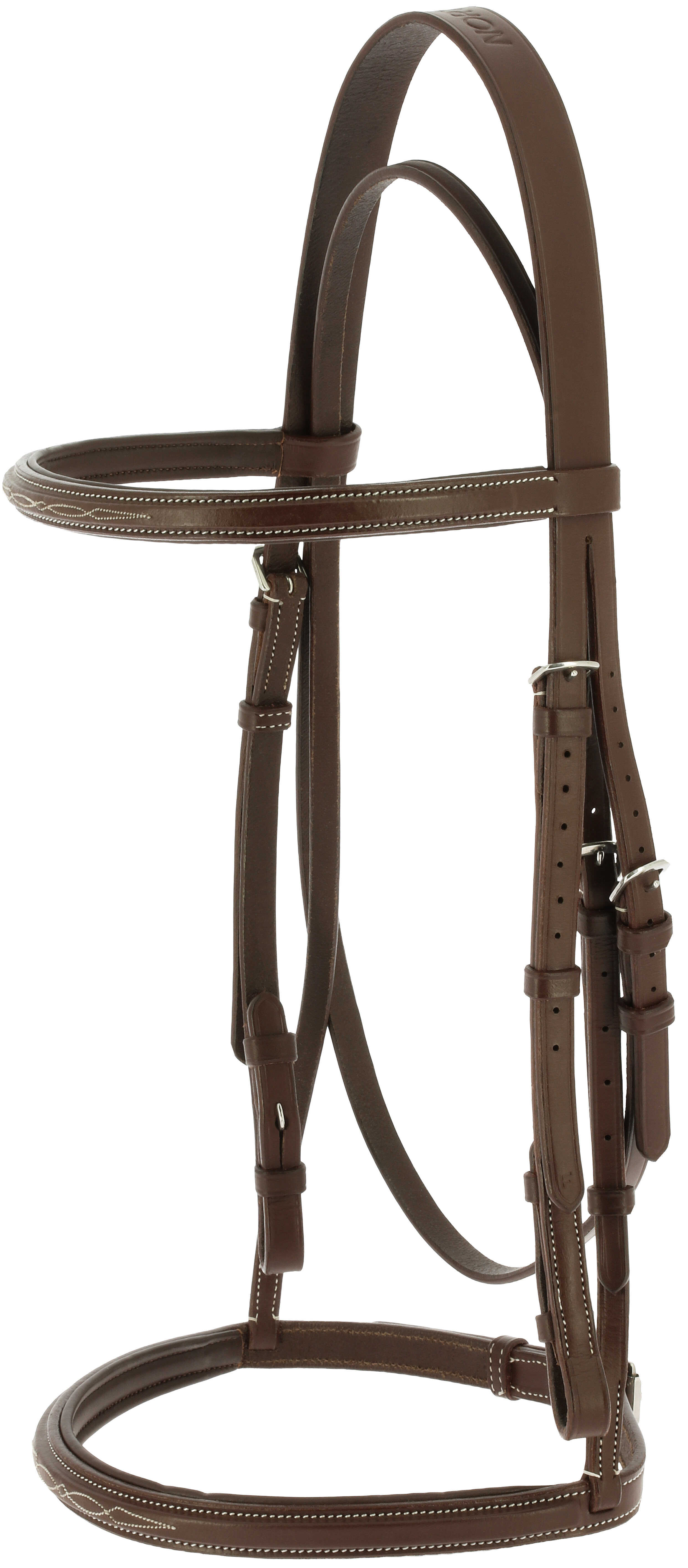 Schlichtes, aber sehr elegantes Aussehen, französisch bombierte Trense und Nasenriemen.