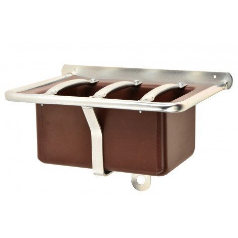 Die braune STUBBYTHENE-Futterkrippe ist in einem stabilen Stahlrahmen mit abgerundeten Ecken untergebracht.